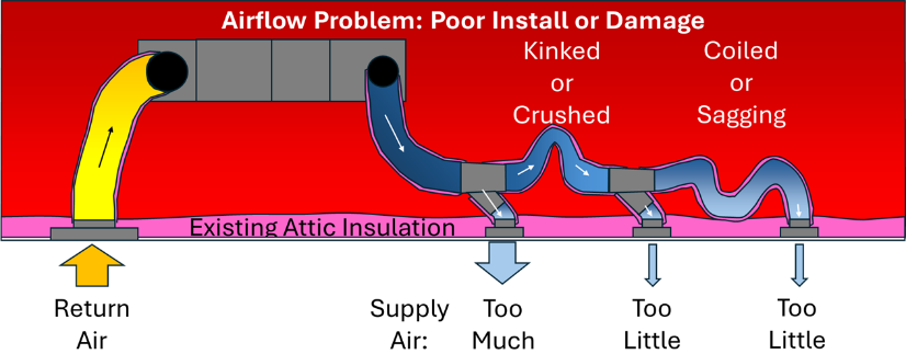 - Poor duct system installation with looped, coiled, sagging, kinked, crushed or otherwise restricted ducts causing faulty room-level airflows.