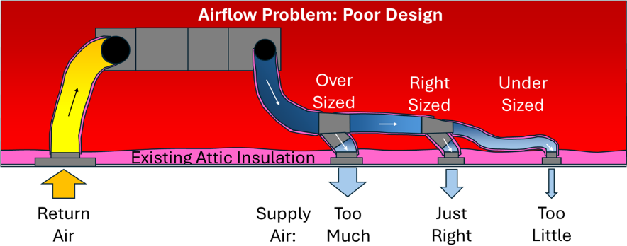 - Poor duct system design with flawed duct sizing and layout causing faulty room-level airflows.