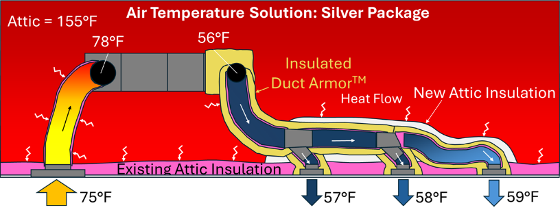 The Silver Package includes all of the duct system enhancements from the Bronze Package except we apply Insulated Duct ArmorTM to the outside of the ducts instead of Aeroseal on the inside. Our Insulated Duct Armor seals, insulates and protects your duct system from further degradation. The Silver Package provides a higher level of comfort, savings and air quality.